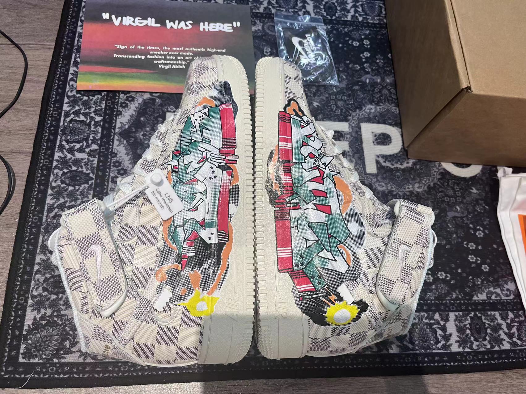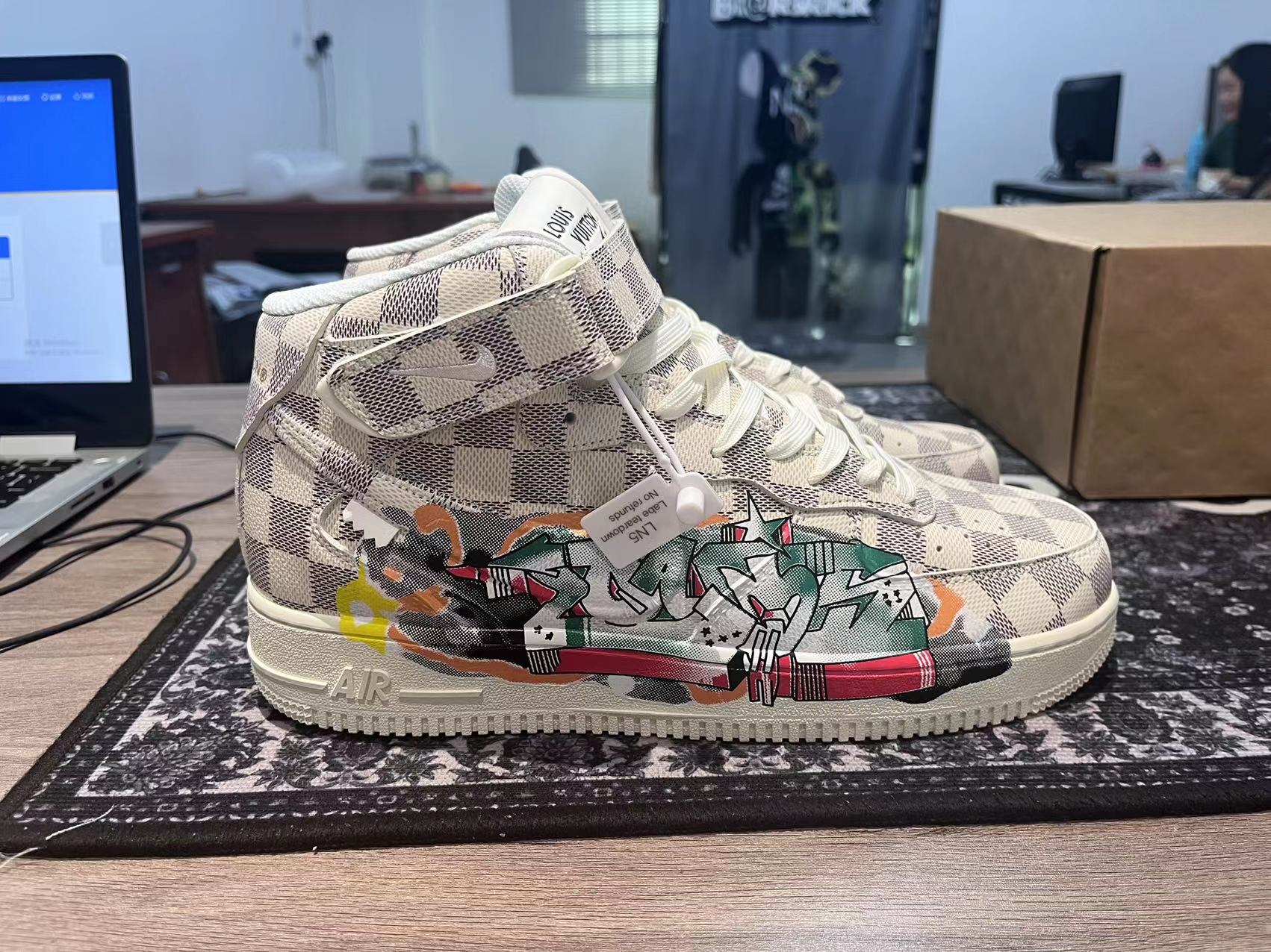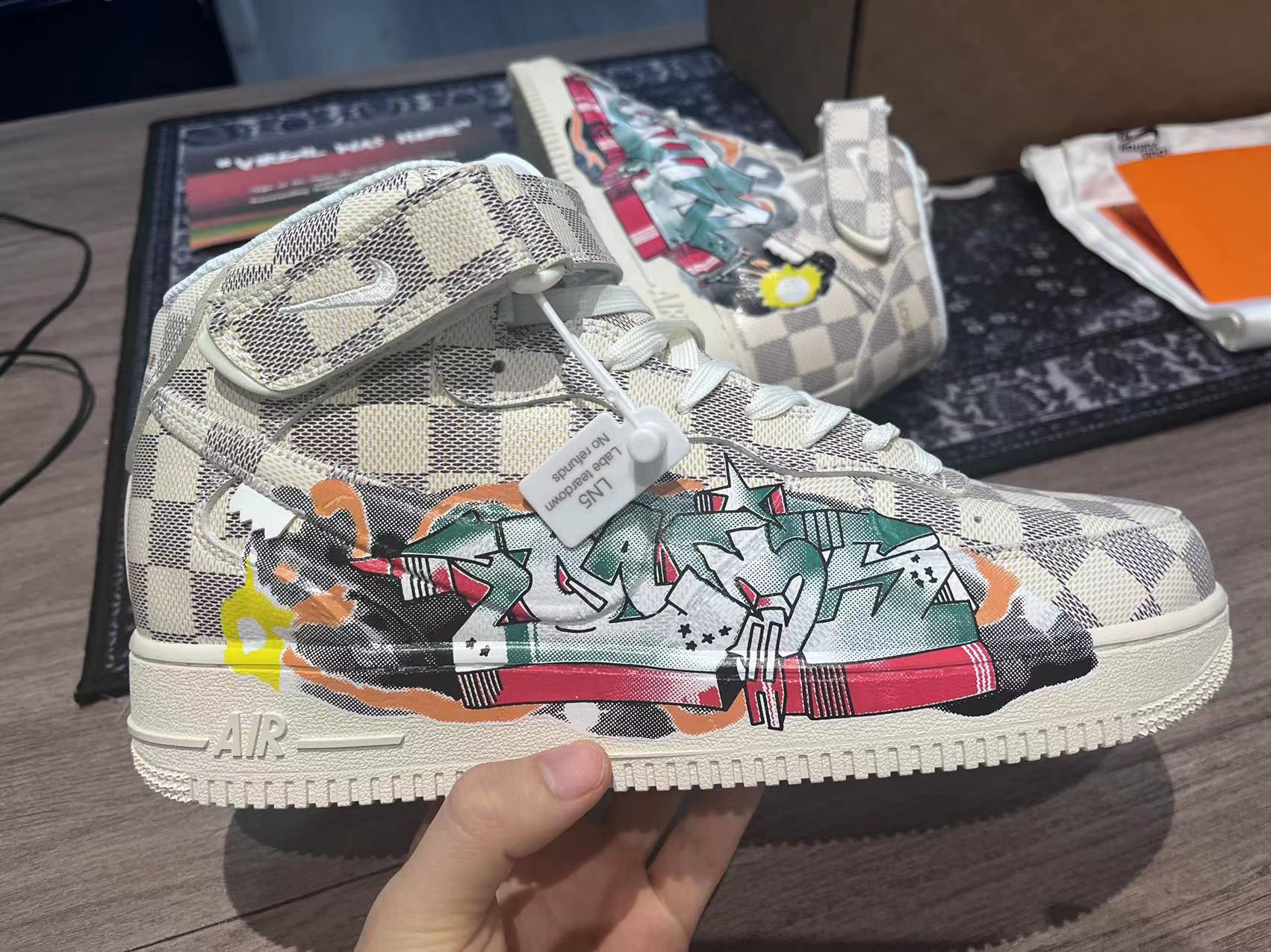 The Louis Vuitton x Nike Air Force 1 Mid “Graffiti” features a leather upper with a beige and brown checkerboard pattern. Its design stands out thanks to the multicoloured graffiti on the quarter panel – a work of the artist Ghusto Leone.
